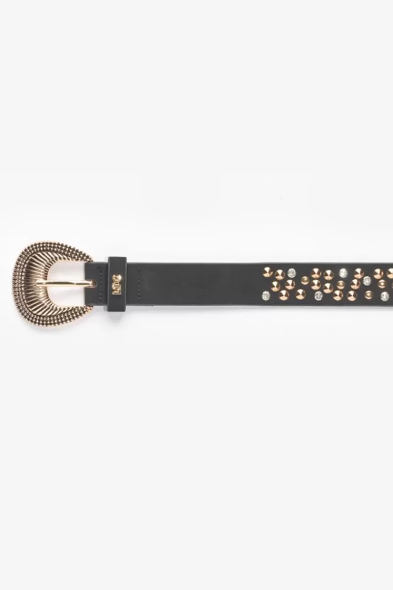 Cette Ceinture Jimena Apportera Une Touche Rock A Vos Tenues Avec Son Cuir Noir Habille De Clous Dores Et De Strass Ainsi Que Sa Boucle Doree.