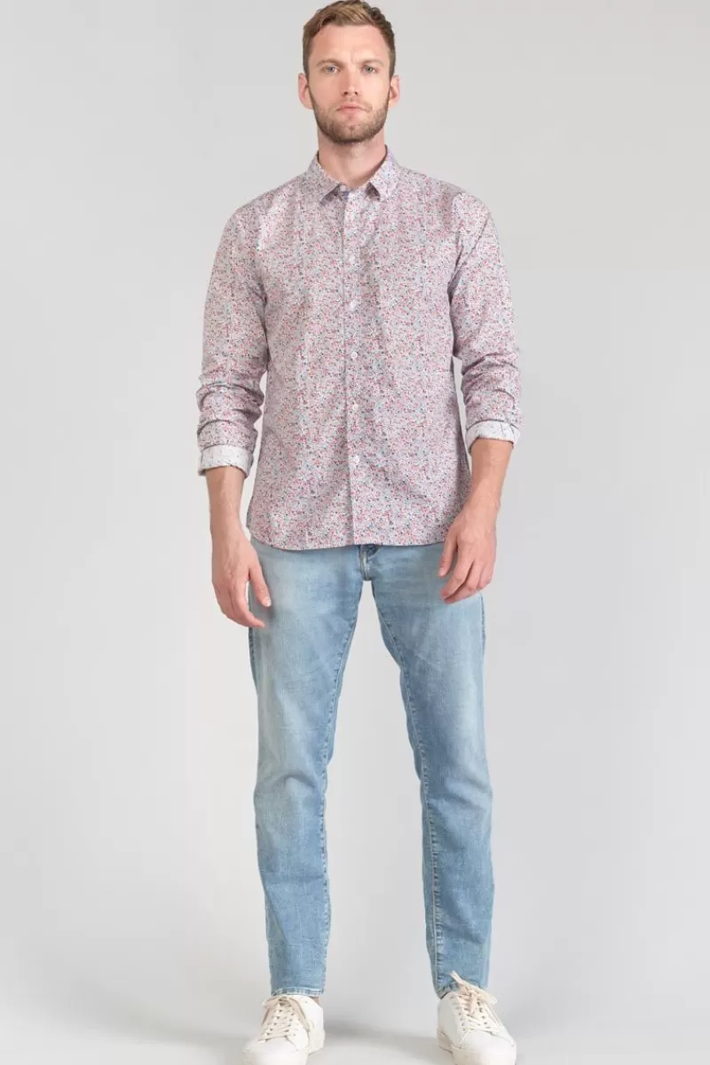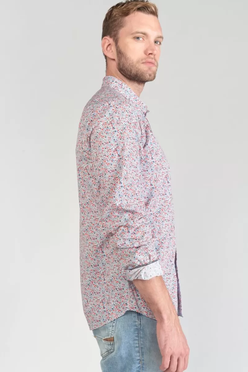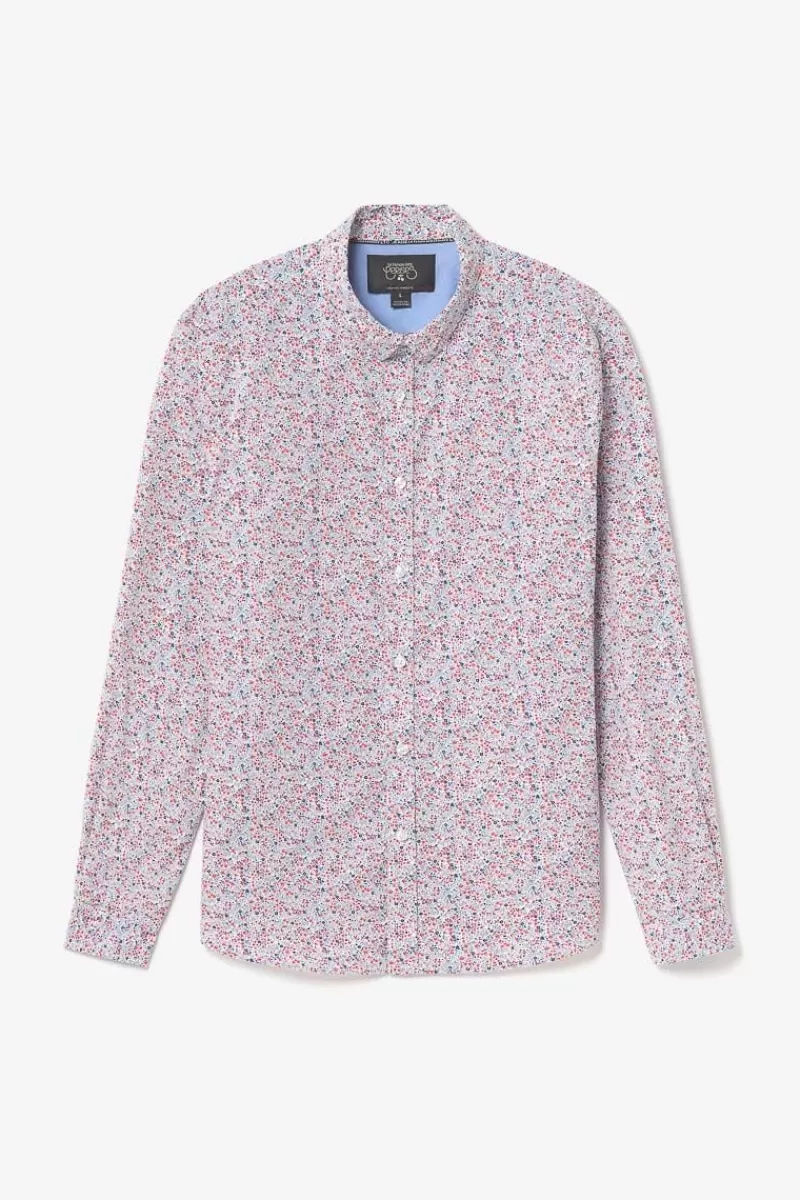 Cette Chemise Rodel Blanche Vous Donnera Un Look Elegant Avec Son Motif A Petites Fleurs Rouges Et Bleues, Ses Boutons Nacres Blancs Et Ses Revers Aux Poignets Avec Lisere Personnalise « Le Temps Des Cerises » Et Empiecement Contrastant Bleu Ciel.Pour Le Detail Final, Un Mini Lisere Drapeau Bleu, Blanc, Rouge Dans Le Dos.