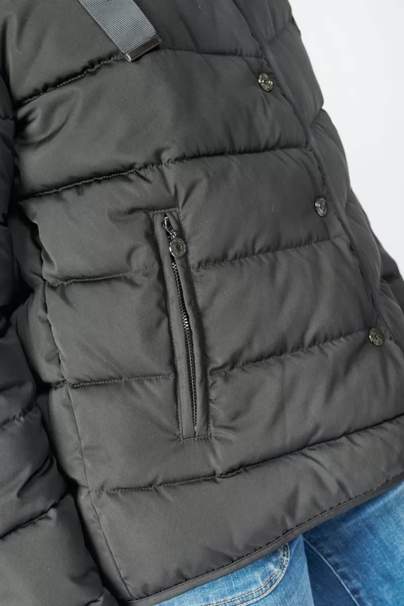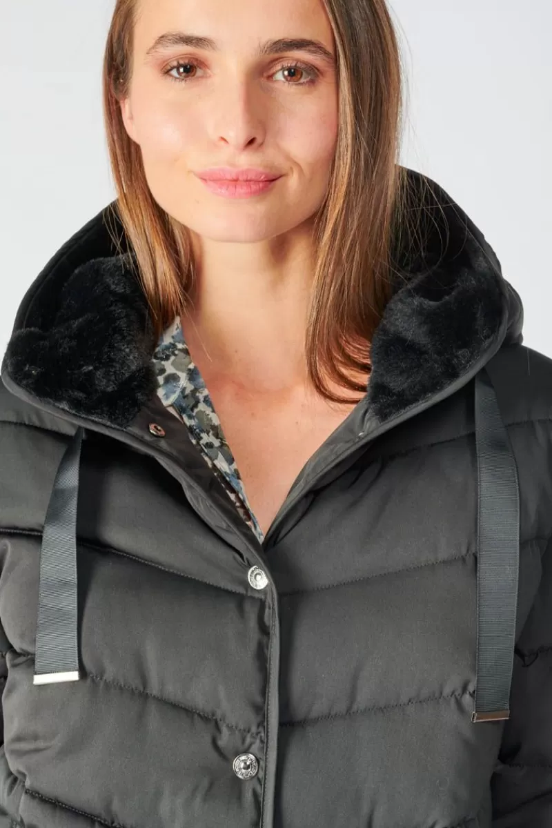 Cette Doudoune Isy Noire Est Une Piece Intemporelle A Avoir Dans Son Dressing Avec Ses Details Feminins Comme Sa Fausse Fourrure Lisse Dans La Capuche, Son Lien Ruban Autour De La Capuche, Sa Fermeture A Boutons Pression Argentes Et Ses Deux Poches Avec Zips Argentes A L’Avant. Une Poche Interieure Complete La Piece.